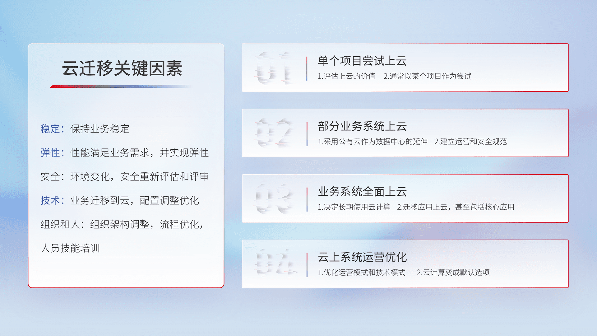 结合实际业务,,,,从规划设计、、、、云平台选型、、云原生改造、、数据迁移、、、集成交付,,,,迁移全过程为客户识别最佳上云路径,,,,做好风险识别管理,,设计网络架构、、、、身份权限、、、安全审计合规、、、、操作审计、、日志审计、、监控告警策略、、、、多站点容灾设计等,,对云上基础设施进行整体规划,,提升IT治理水平,,以满足弹性、、高可用、、高性能的需求。。。。
